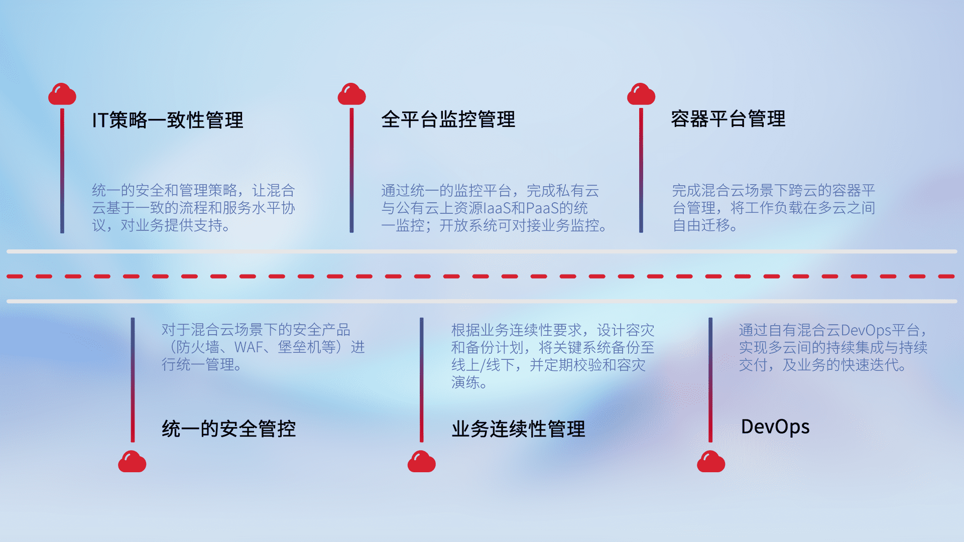 通过多云纳管,,以统一的资源数据模型把客户的云资源进行抽象和封装,,,,进而实现对多云资源的统一操作,,保障云资源管理的可靠性、、、稳定性与可用性。。。。量身定制化运维内容,,,配置、、、开发运维、、、、补丁管理、、备份、、、监控、、、认证和访问管理、、、审计和日常巡检等,,,保障在用云过程中的可靠度,,,稳定度以及高可用率。。。