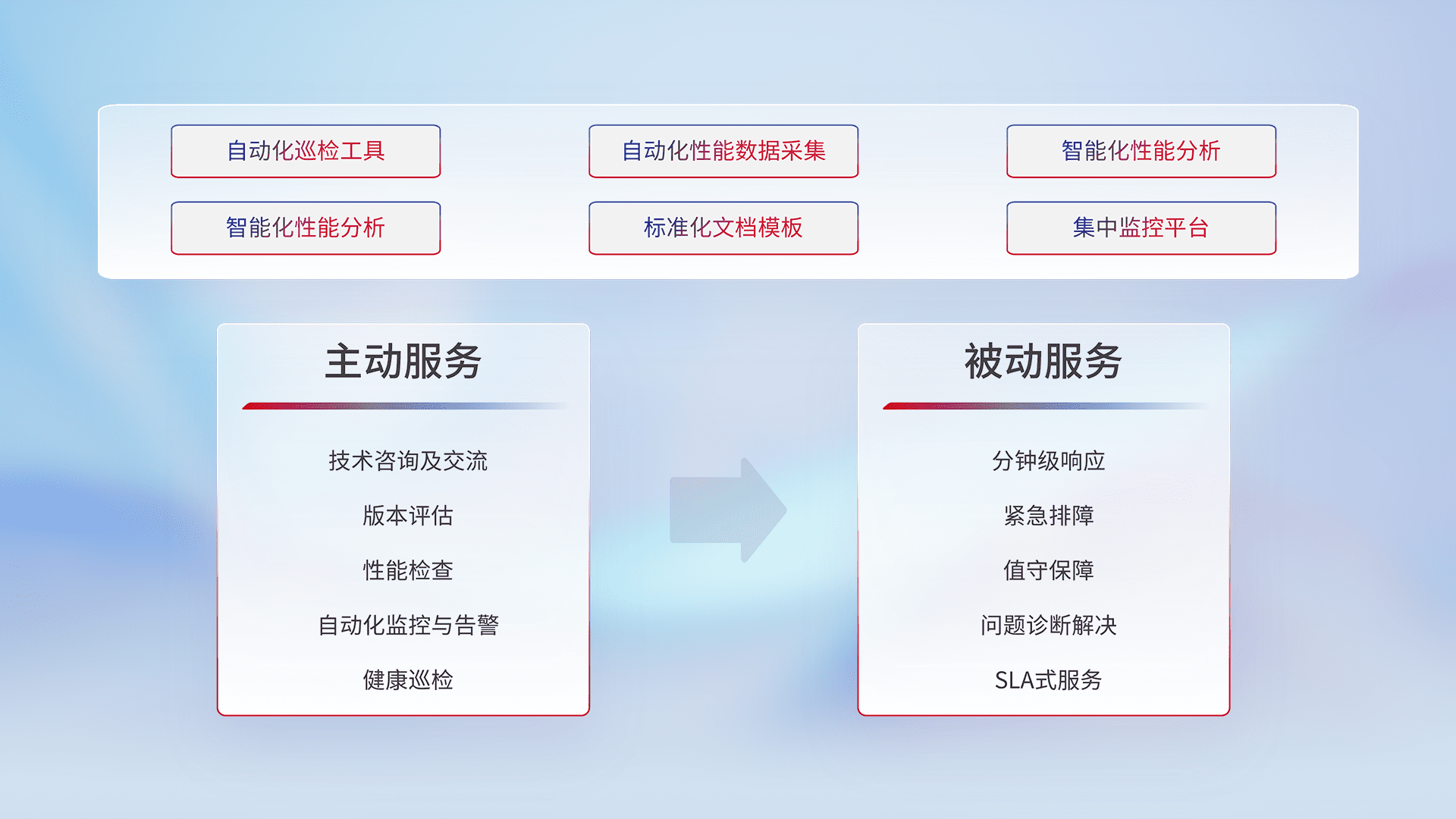 智能化工具和标准化文档,,保障服务质量,,,,提供主动服务(包含技术咨询、、版本评估、、、性能检查、、、、自动化监控与告警、、、健康巡检)和被动服务包含(分钟级响应、、、紧急排障、、值守保障、、、、问题诊断解决、、SLA服务)。。