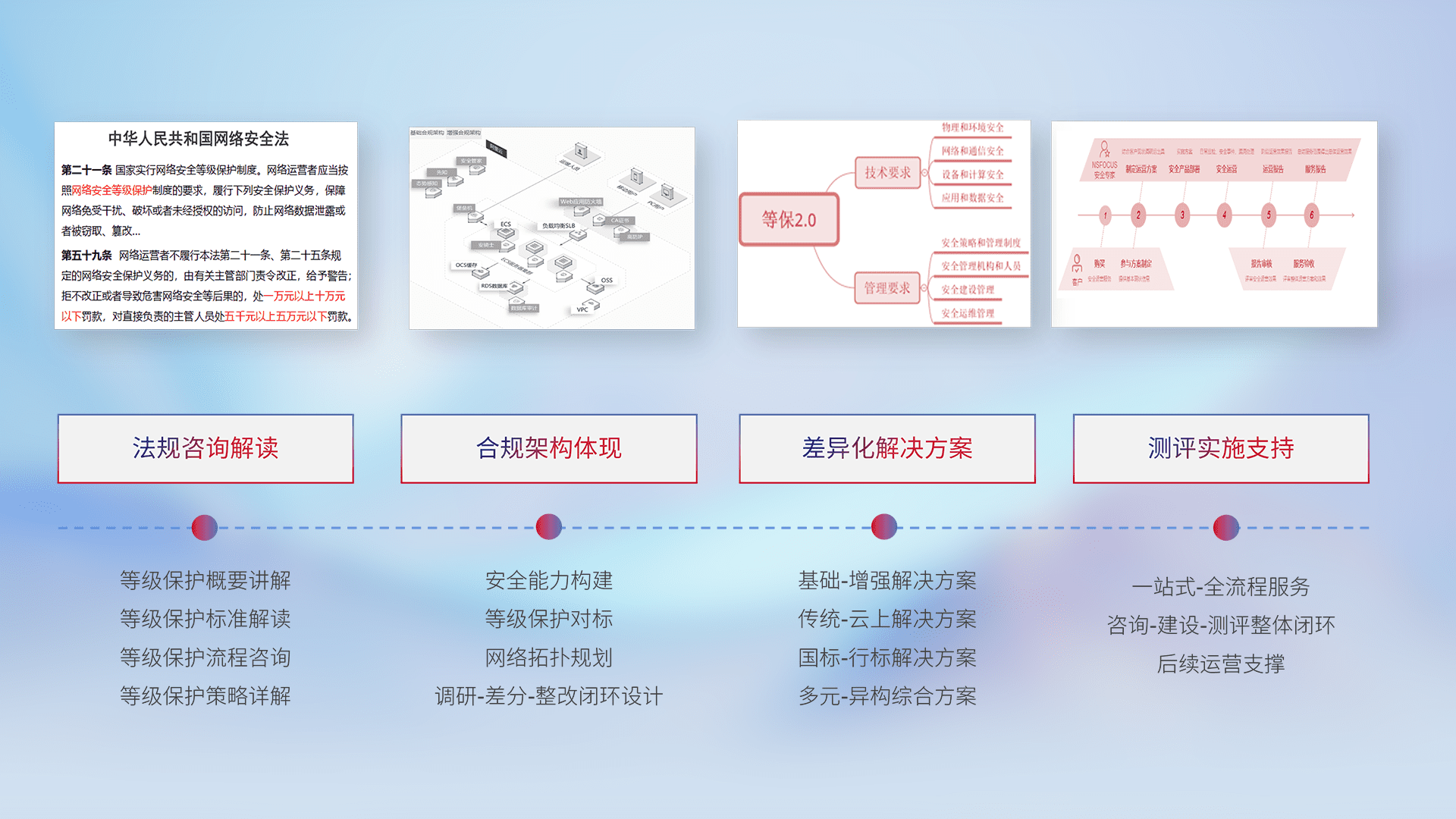 通过专业的法律咨询解读、、、合规架构体现、、、差异化解决方案、、测试实施支持等服务,,,为客户量身打造等保合规体系。。。。